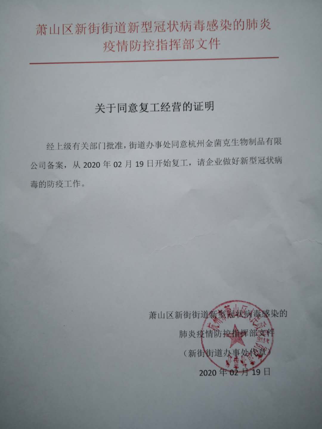 從人員,設備,儀器,消毒,口罩,測溫槍,管理,宣傳等方面, 經過數天的精心準備與嚴密部署,現有條件滿足上級疫情防控主管部門的要求,經過嚴格現場審查,于2 月19日,公司被杭州市蕭山區疫情防控指揮部批準為二批復工企業。即日起,公司恢復正常運營,竭誠為廣大新老客戶提供真誠服務。
